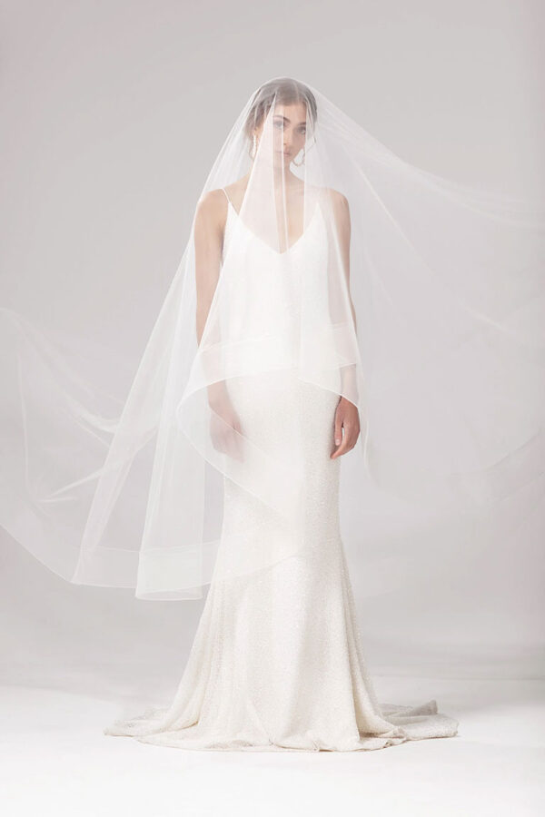 Elevate your bridal look with the Blake veil, a stunning double-tier design that can be worn blusher-style or cascading beautifully behind. Its bold 10cm crinoline trim defines each layer for a dramatic and structured silhouette.