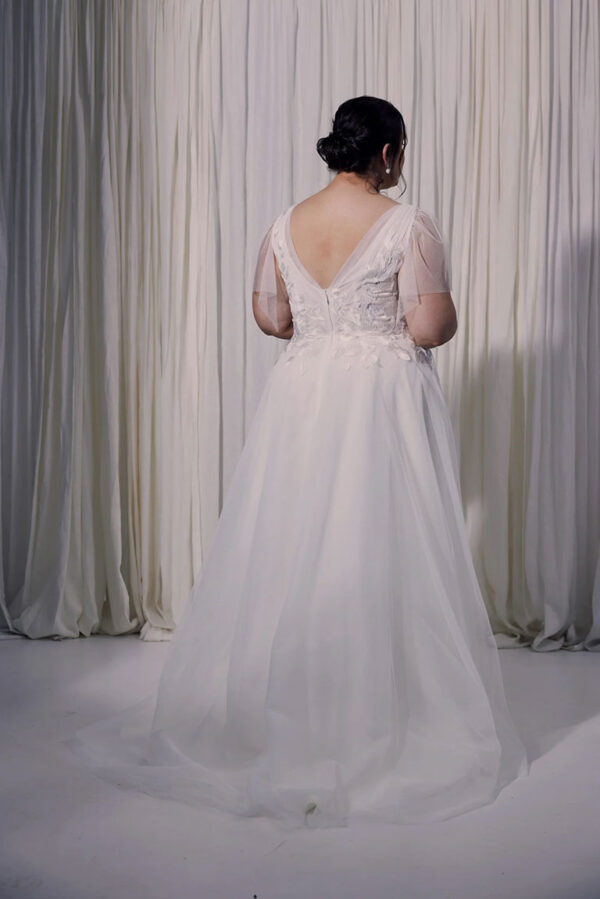 Crafted with the Elodie gown in mind, Ella is a V-neck soft tulle gown with a soft rouched bodice, delicate flutter sleeves and embroided lace applique trailing into a soft flowing skirt. A truly romantic gown.