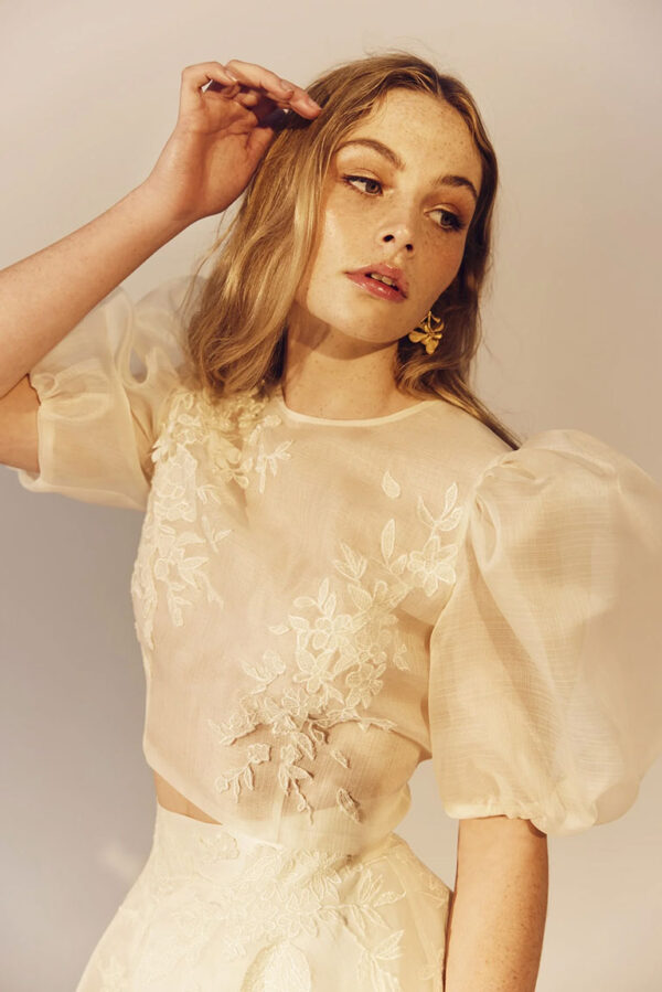 The Calèche two-piece wedding dress, Elsie and Iris, is a perfect balance of sophistication and whimsy. Crafted from pineapple organza with silk and cotton embroidery motifs, this ensemble features an elegant top with an open diamond-shaped back and voluminous puff sleeves. Paired with a flowing skirt, this design offers a fresh take on bridal fashion, perfect for the bride seeking individuality.