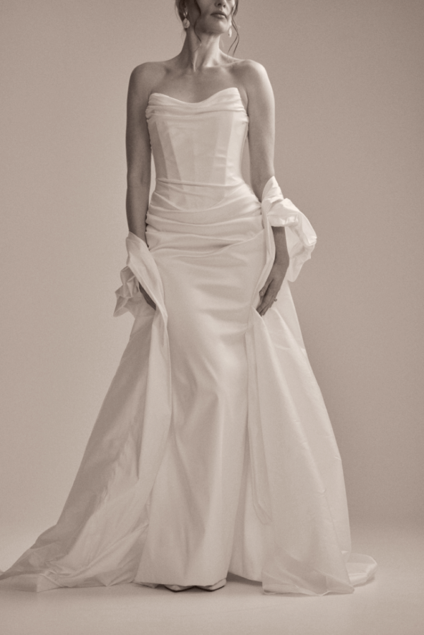 Jayne is a masterclass in sculpted sophistication, with a corseted bodice that hugs the figure, and her skirt adorned with elegant draping. A light taffeta opera coat sweeps behind, adding a layer of drama that commands attention. Modern, refined, and effortlessly cinematic.
