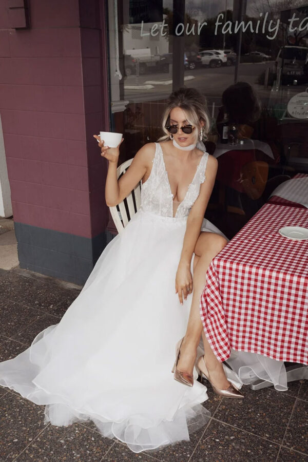The Liliana wedding gown combines bold elegance with intricate detailing. Its plunging sheer V-neckline is adorned with 3D lace, flowing into a voluminous organza and tulle skirt with a chic side split.