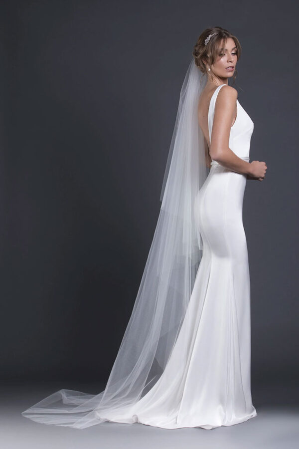 Understated and elegant, the Megan wedding dress offers a minimalist satin design with a deep V neckline at the front and back. A thin sash at the waist completes this effortlessly chic look.