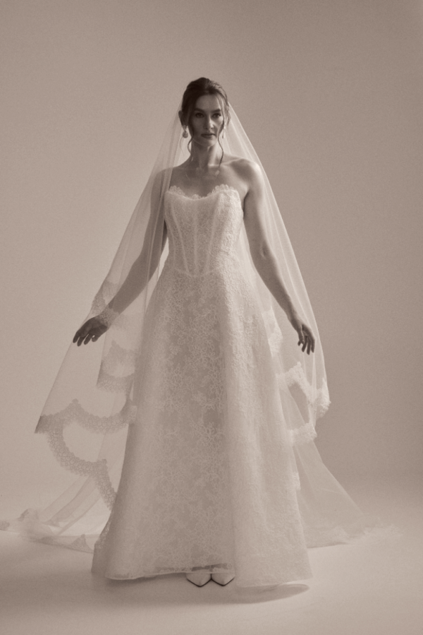 Tippi is an ode to romance, crafted in opaque corded lace with a structured corset and sweeping A-line skirt. The detachable sheer under-bodice with sleeves and high neck adds an indulgent layer of transformation. A gown that is classic at heart and contemporary in detail.